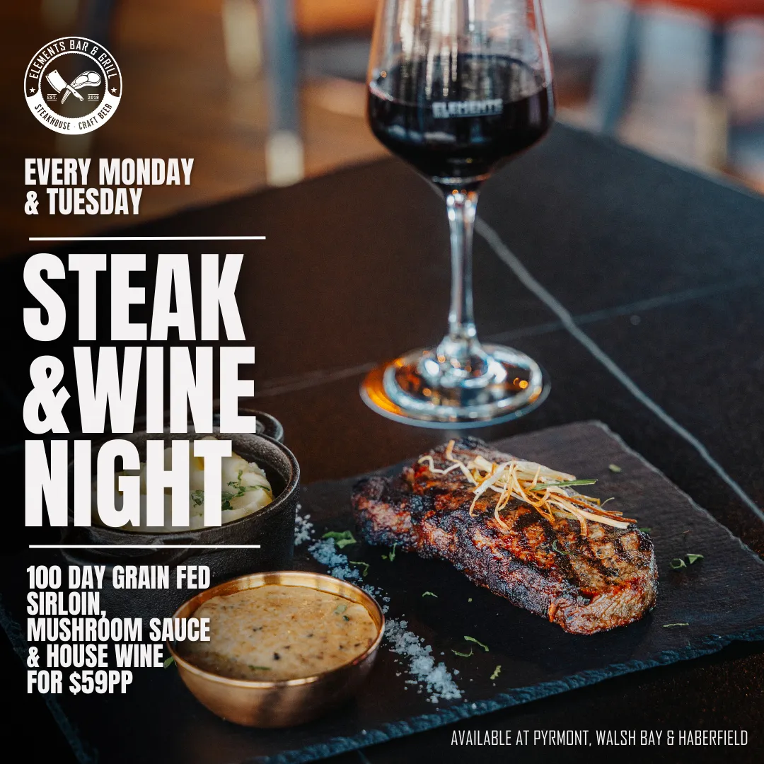 Join us every Monday & Tuesday night for Steak and Wine Special for only $59! Enjoy a perfectly cooked sirloin steak served with parmesan mascarpone potato puree and a rich mushroom sauce. Choose a glass of Pinot Noir or Pinot Gris to complement your meal. Available at Elements Bar and Grill restaurants in Pyrmont, Walsh Bay, and Haberfield.